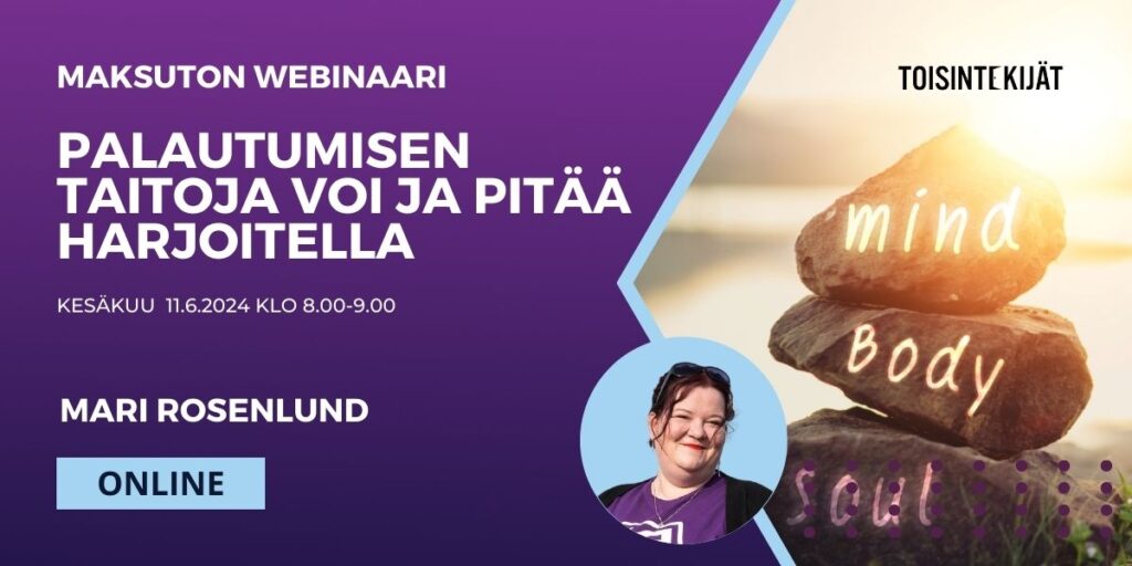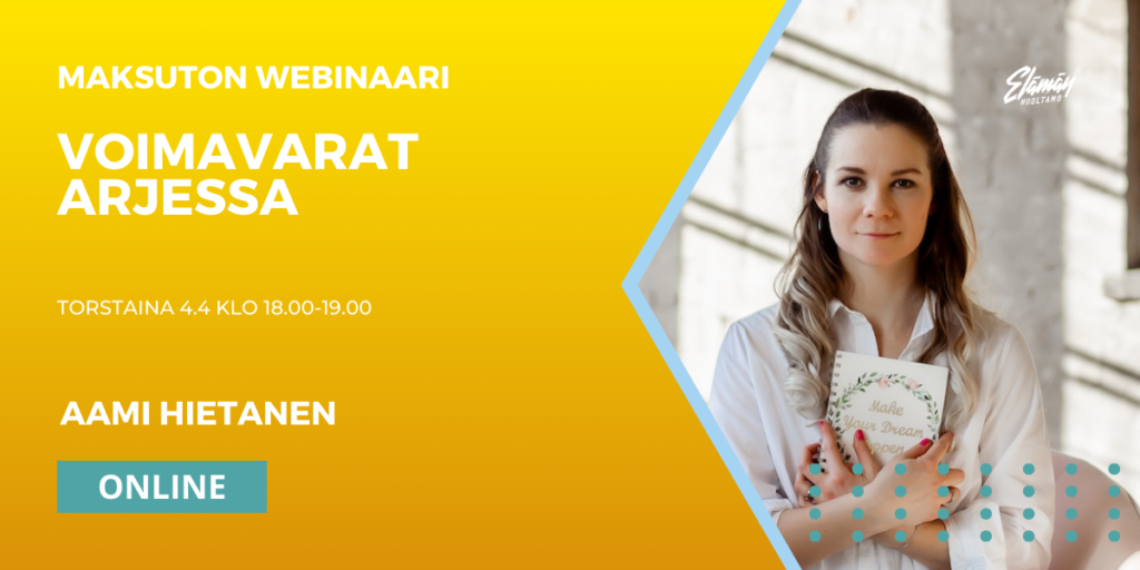 Liity mukaan maksuttomaan webinaariimme, jossa vieraamme Aami Hietanen luotsaa meidät hyvän olon äärelle. Webinaarissa pysähdytään hetkeksi ensin rentoutumaan, jonka jälkeen syvennymme harjoitteiden kautta miettimään oman arjen voimavaroja. Mitkä asiat syövät niitä ja mistä juuri sinä voisit saada lisää voimavaroja sinun arkeesi? Kysymysten ja tehtävien avulla jokainen tekee webinaarin aikana itsenäistä työtä. Tunnin päätteeksi Aami vastaa osallistujien kysymyksiin.
