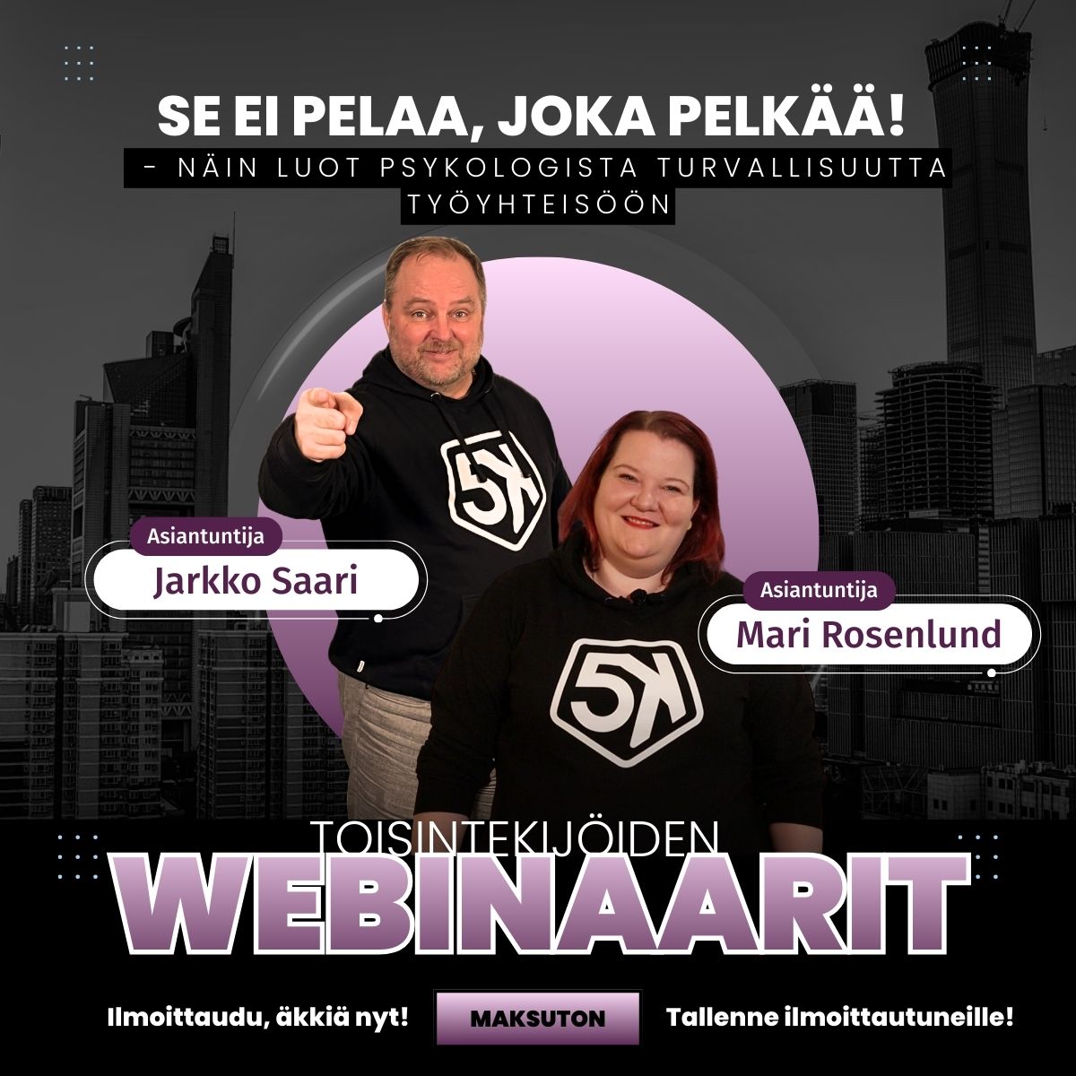 Webinaari kutsuu tarkastelemaan sekä yksilön että työyhteisön roolia turvallisen ilmapiirin rakentamisessa.